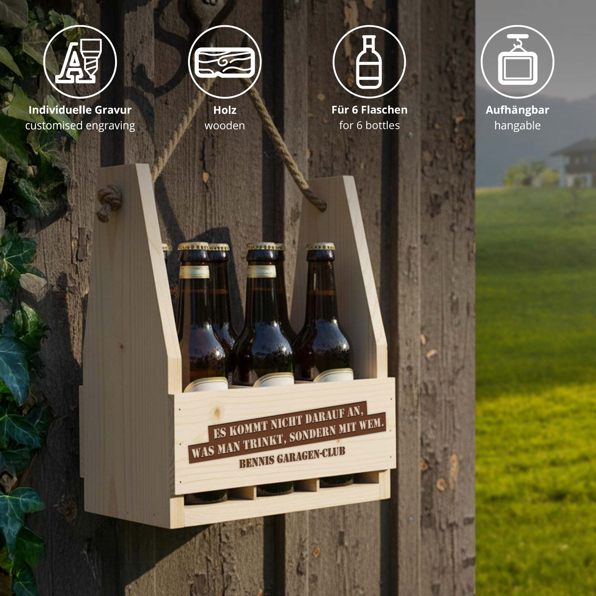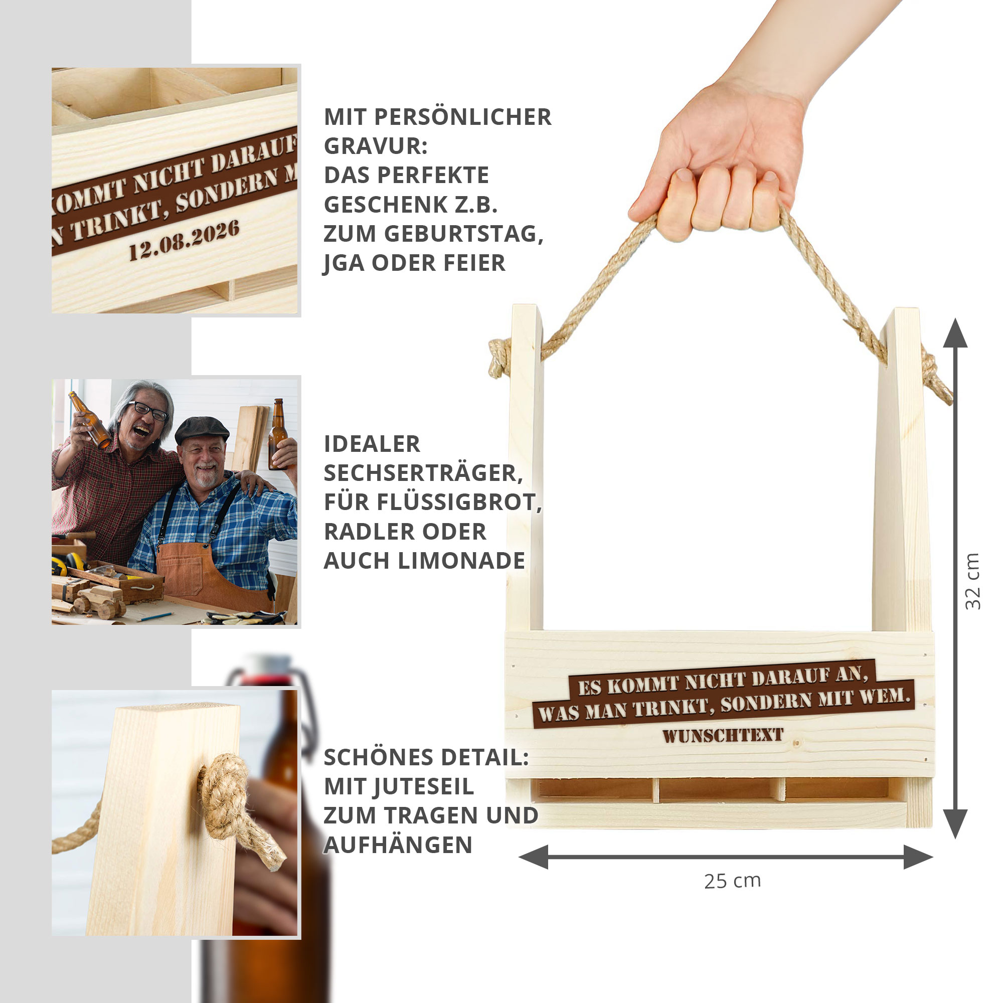 Dieser hochwertige Bierflaschenträger aus Holz vereint praktischen Nutzen mit einer individuell gestaltbaren Botschaft. Veredelt mit dem Spruch "Es kommt nicht darauf an, was man trinkt, sondern mit wem" und ergänzt durch Deinen persönlichen Wunschtext wird daraus ein einzigartiges Geschenk für ganz unterschiedliche Anlässe. Ob Namen eines Paares, ein Team-Spruch oder eine persönliche Widmung – Du gestaltest den Flaschenträger ganz nach Deinen Vorstellungen und verleihst ihm eine besondere Bedeutung.
