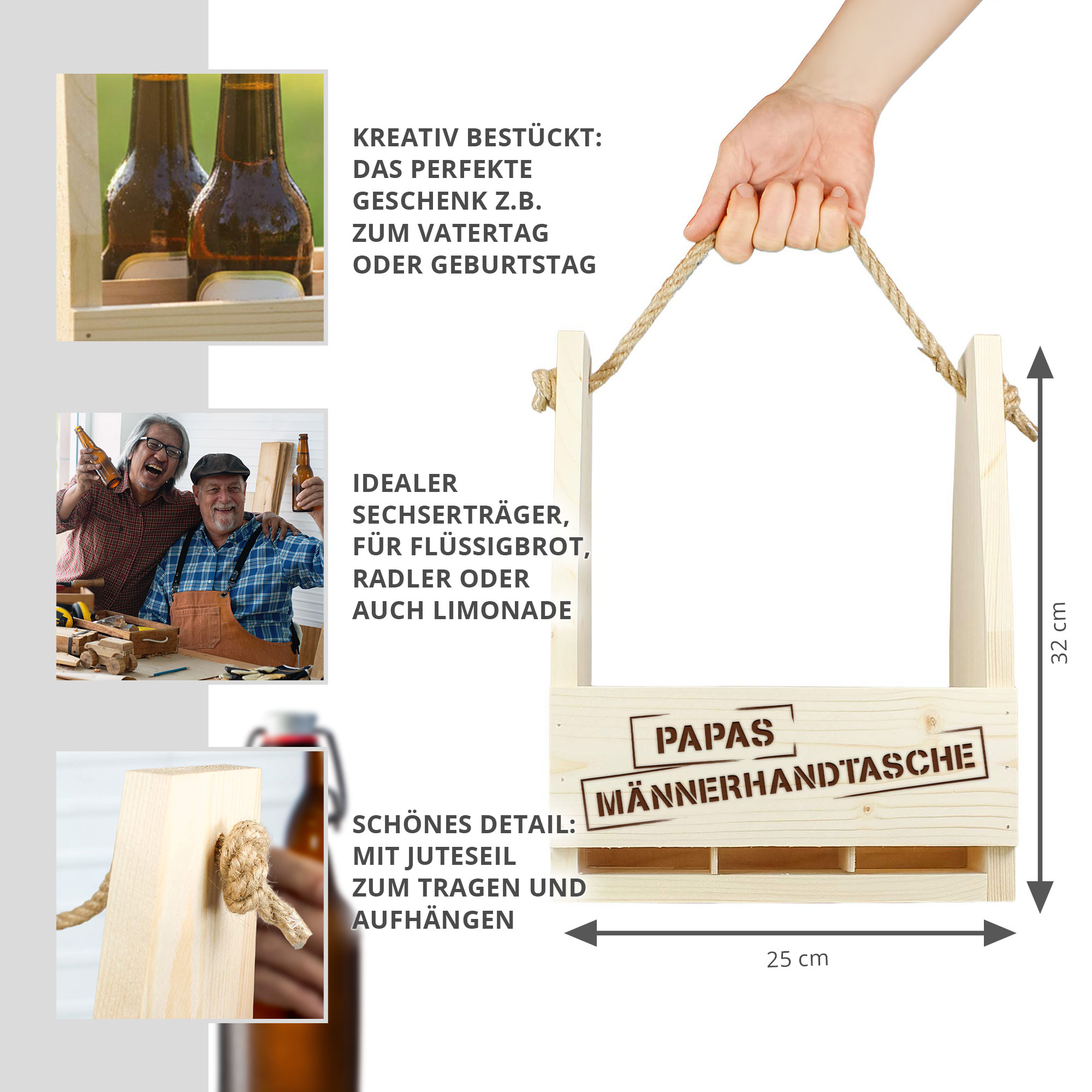 Mit diesem Bierflaschenträger im Design "Papas Männerhandtasche" schenken Sie nicht nur ein praktisches Accessoire, sondern auch ein echtes Highlight für jeden Anlass. Der hochwertige Holzträger überzeugt durch seine stabile Bauweise und bietet ausreichend Platz für mehrere Flaschen. Die stilvolle Gravur macht ihn zu einem besonderen Geschenk für Väter.