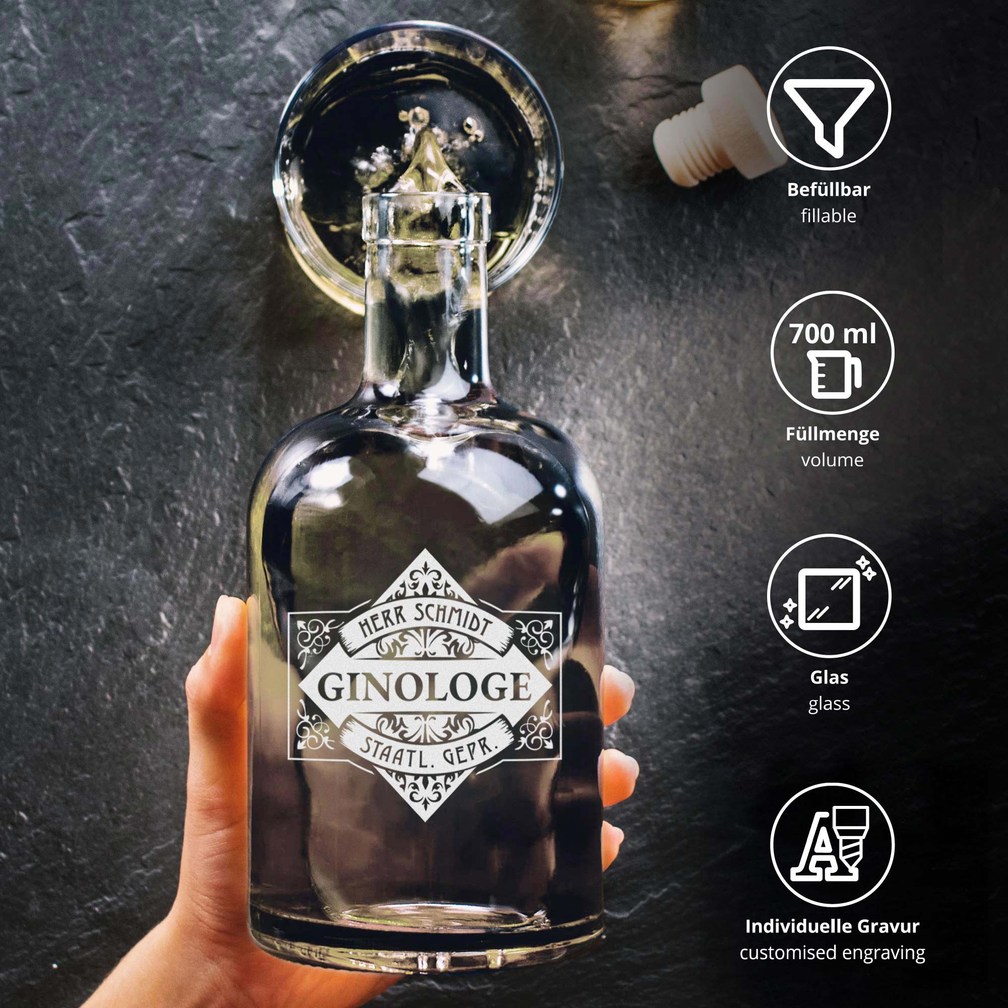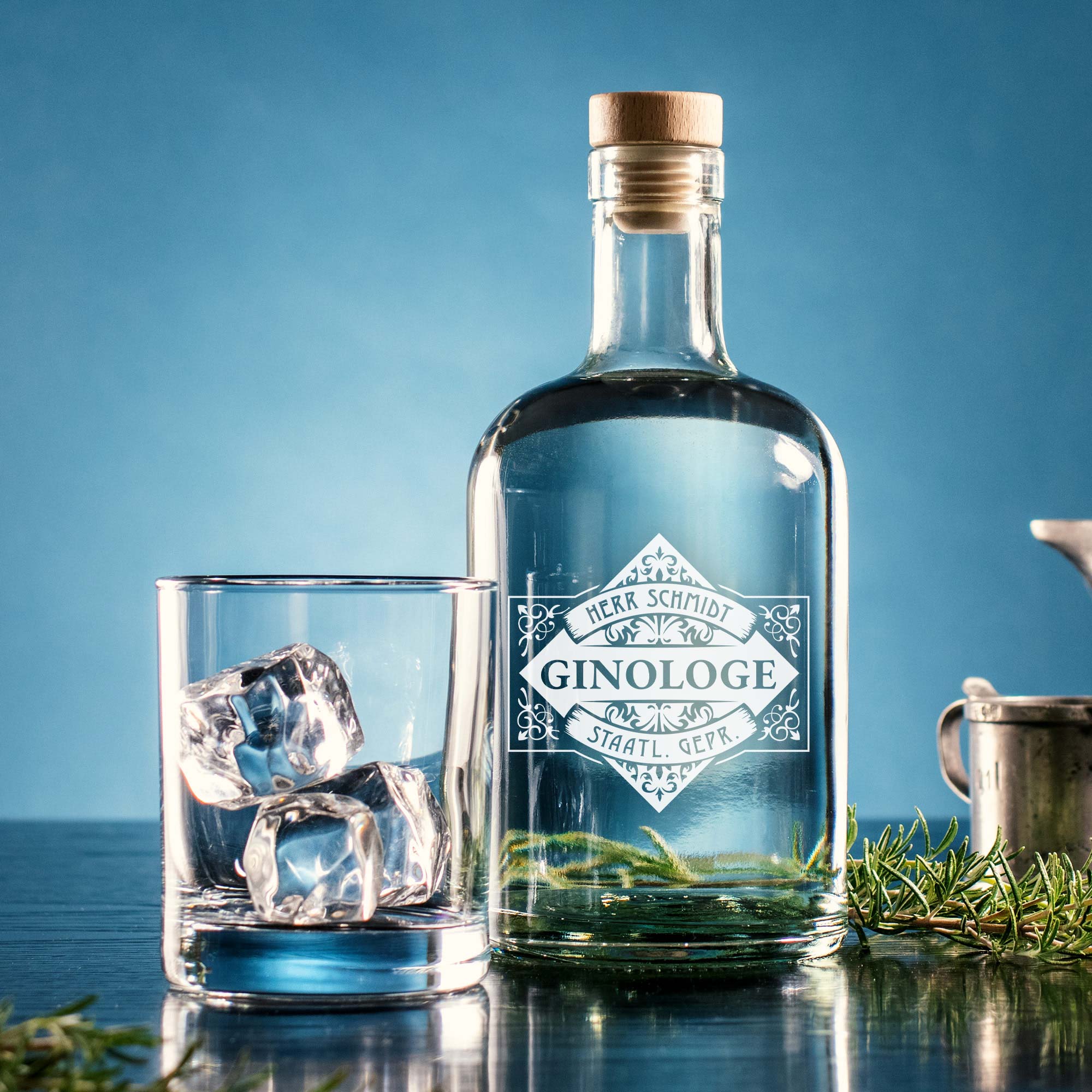 - Glasflasche mit Gravur "GINOLOGE – Staatl. gepr."