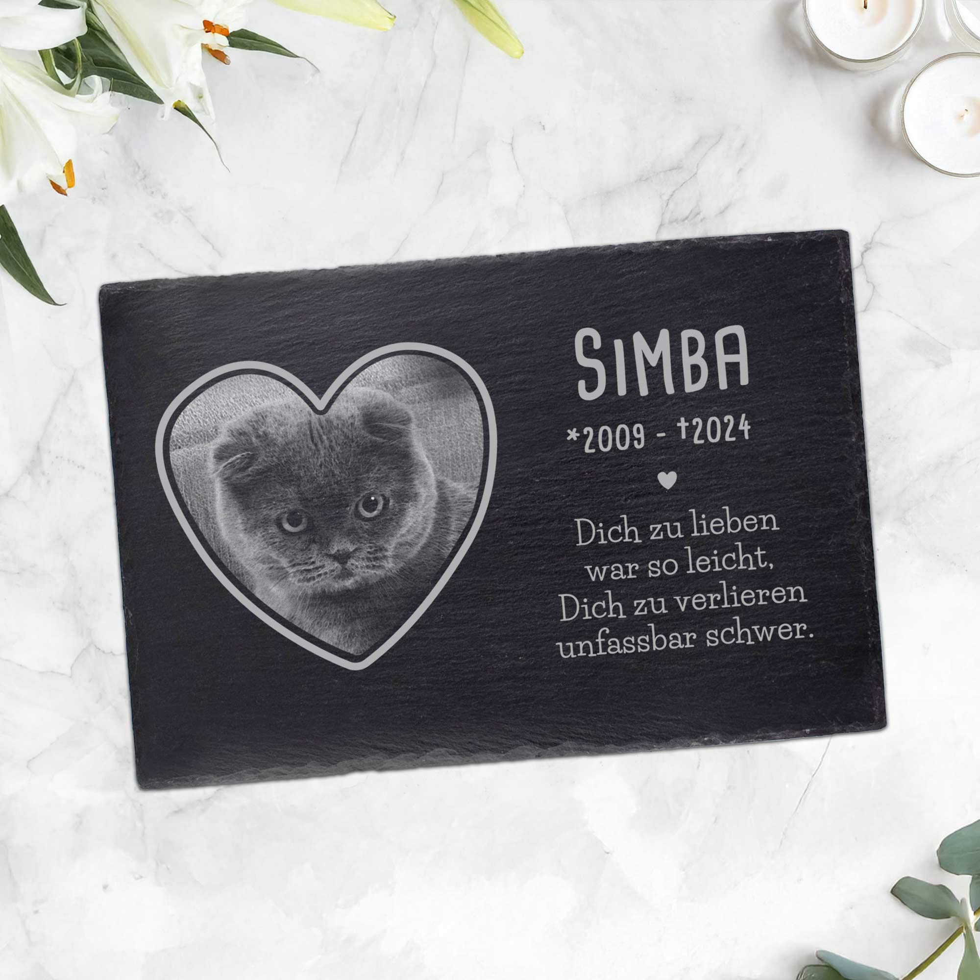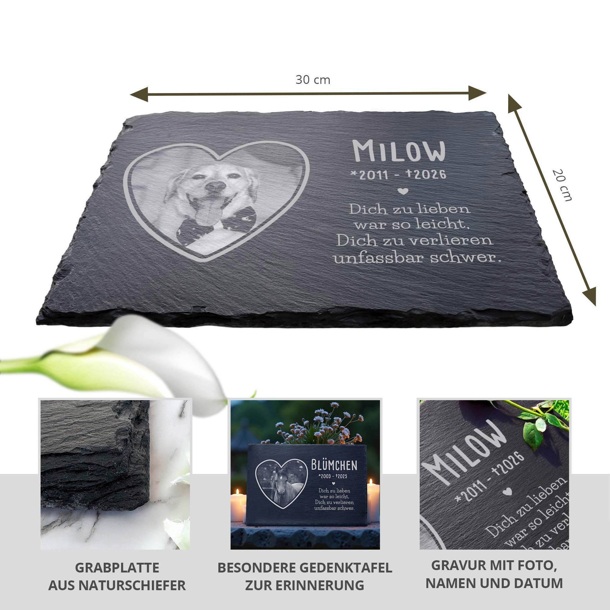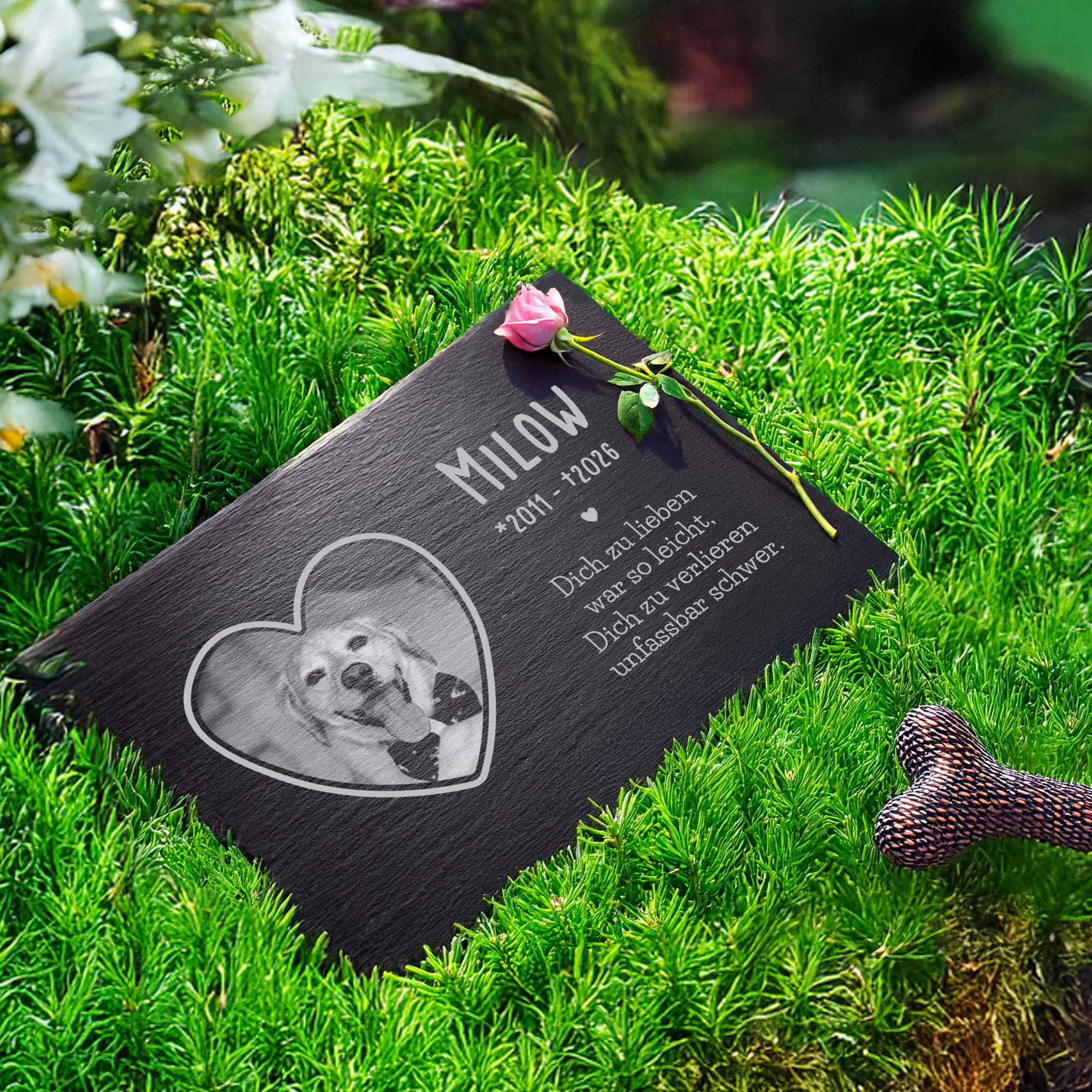 Diese edle Grabplatte aus echtem Schiefer ist ein würdiges Andenken an Ihr geliebtes Haustier. Mit individueller Gravur von Name, Lebensdaten und dem einfühlsamen Gedenkspruch Dich zu lieben war so leicht, Dich zu verlieren unfassbar schwer, wird sie zu einem einzigartigen Erinnerungsstück. Das Lieblingsfoto Ihres Tieres wird in ein zartes Herzmotiv eingebettet und mit höchster Präzision auf der Natursteinplatte verewigt. So entsteht ein persönliches Unikat, das die Verbundenheit und Liebe zu Ihrem treuen Begleiter auf besondere Weise ausdrückt.