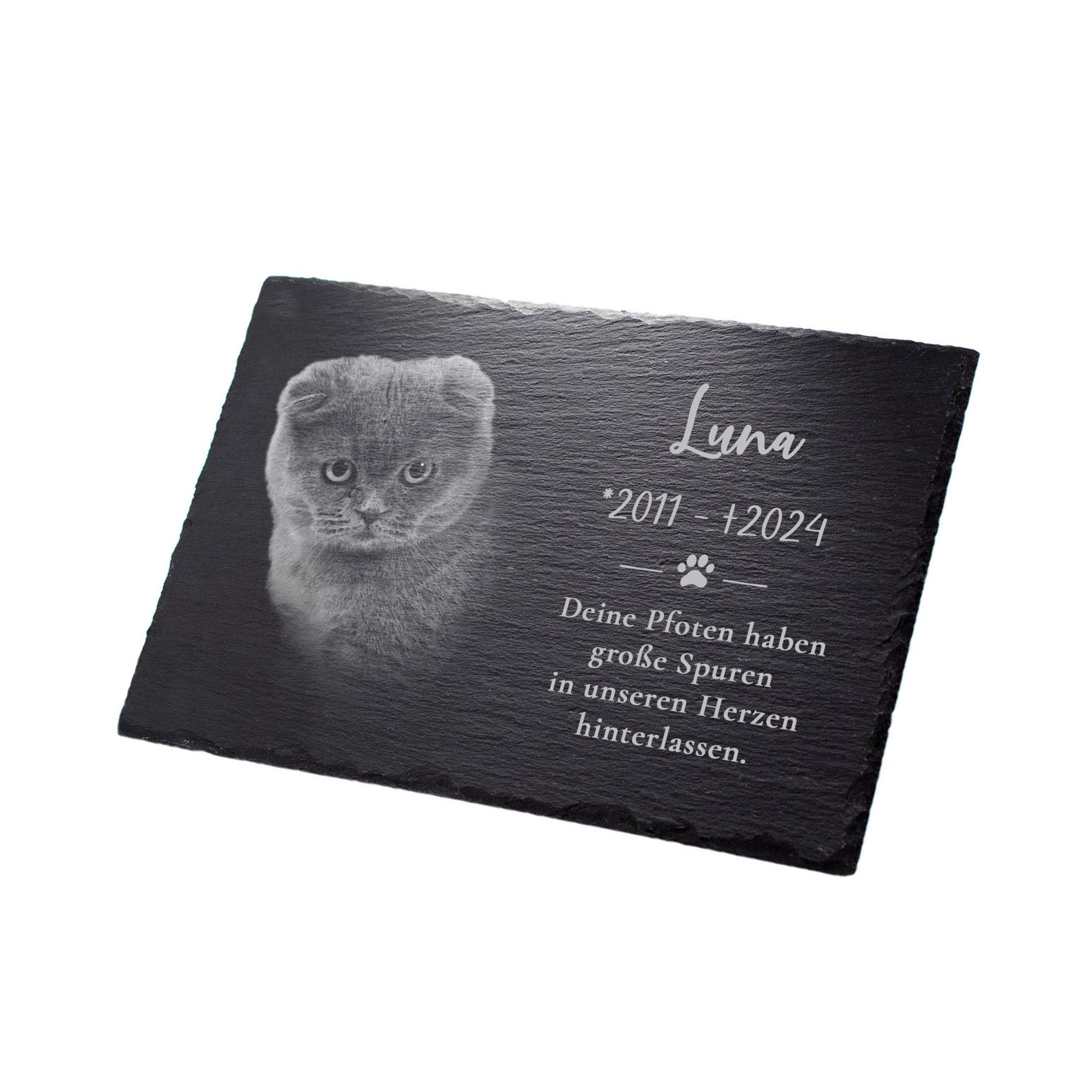 Diese liebevoll gestaltete Grabplatte aus echtem Schiefer ist eine würdevolle Erinnerung an Ihren treuen Begleiter. Mit einer persönlichen Gravur des Namens, der Lebensdaten und dem berührenden Trauerspruch Deine Pfoten haben große Spuren in unseren Herzen hinterlassen, entsteht ein einzigartiges Andenken voller Wärme und Wertschätzung. Das Lieblingsfoto Ihres Haustiers wird in Herzform auf der Natursteinplatte eingebettet und macht jedes Stück zu einem individuellen Erinnerungsobjekt. Das schlichte, aber ausdrucksstarke Design mit einer gravierten Pfote symbolisiert die tiefe Verbundenheit zwischen Mensch und Tier.