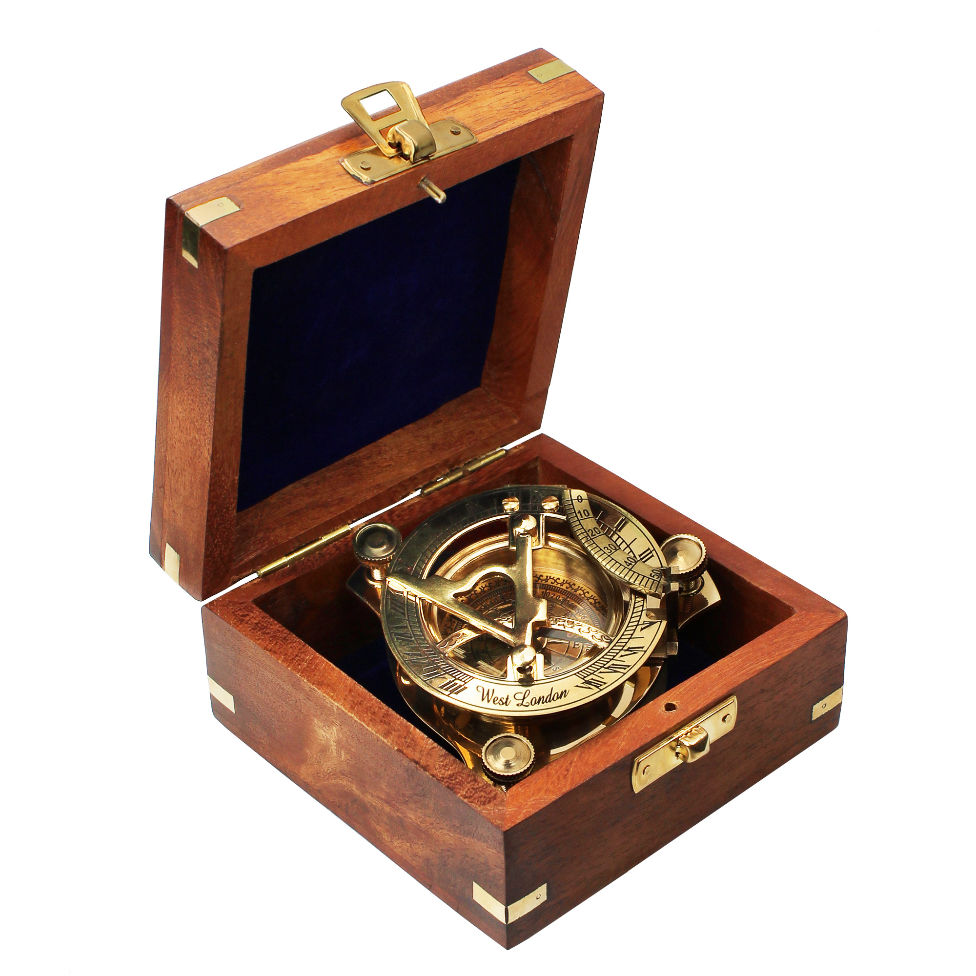 Eine besondere Geschenkidee in altehrwürdiger Goldoptik mit passender Geschenkbox in schlichtem Holzdesign. Übergebe die außergewöhnliche Taschensonnenuhr direkt in der stilvollen Box und überrasche abenteuerlustige Entdecker zu Geburtstagen, Weihnachten oder anderen Feierlichkeiten.