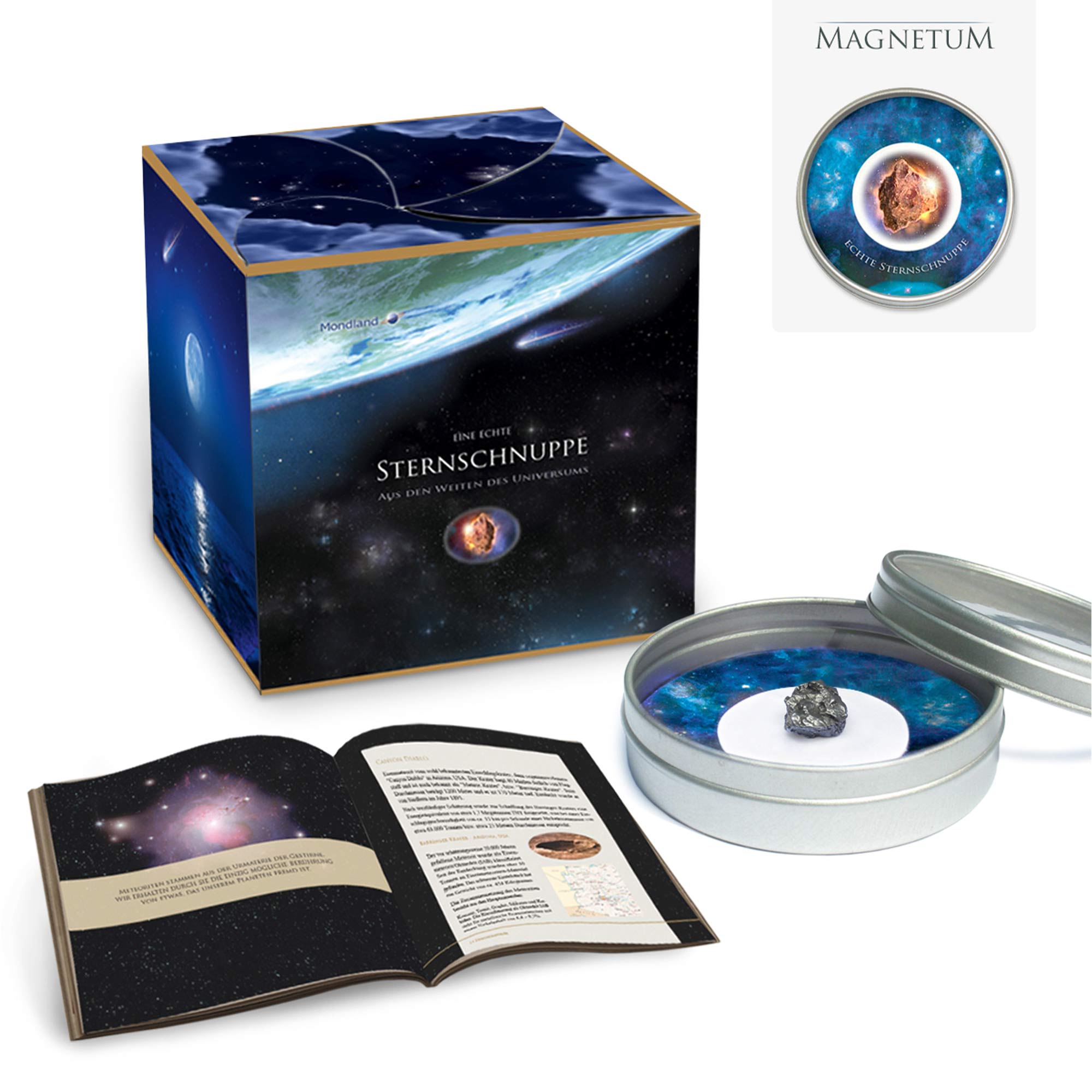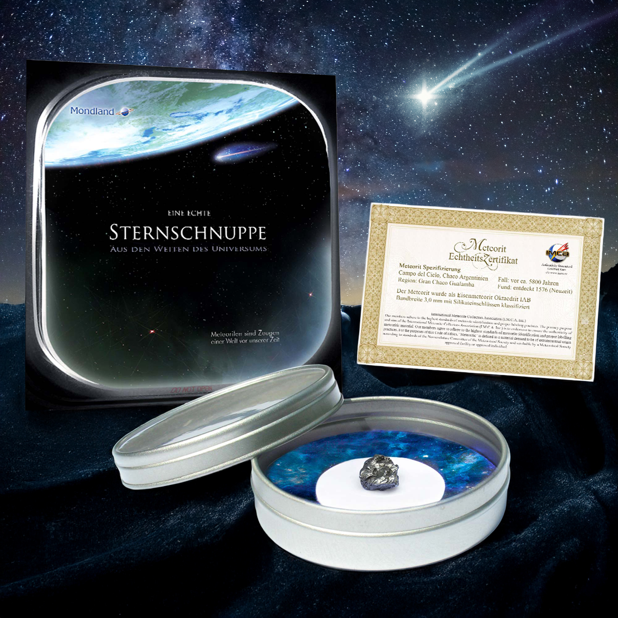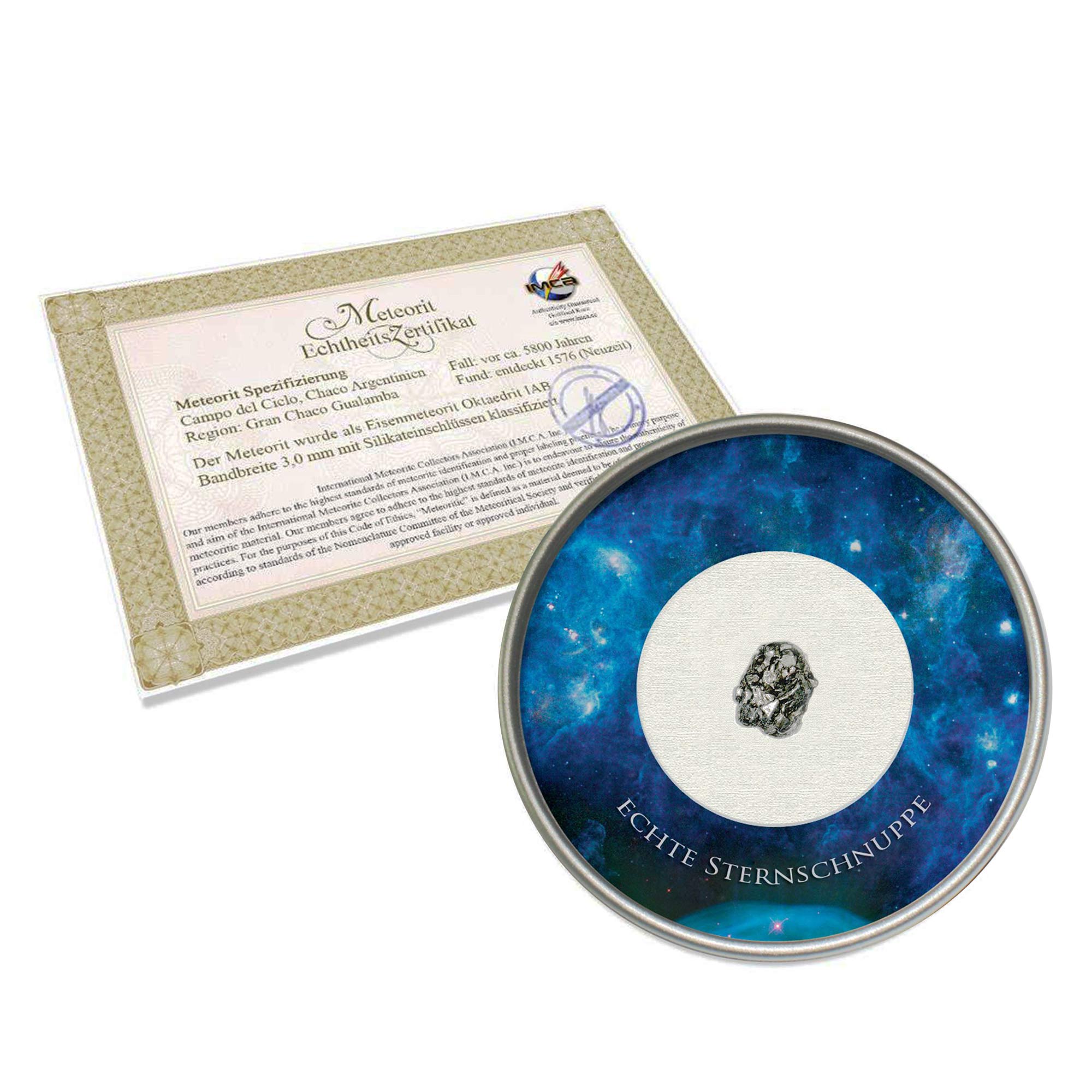 Mit der persönlichen Sternschnuppe von Gravado schenken Sie ein echtes Stück Universum. Jeder Meteor stammt aus den Weiten des Alls und ist ein Unikat – ein kleiner Stein- oder Eisenmeteorit, der mit größter Sorgfalt aufbereitet und mit einem Echtheitszertifikat versehen wird. Die Sternschnuppe befindet sich in einer hochwertigen magnetischen Aluminiumdose mit Sichtglas – ideal zur Präsentation und als Sammlerstück. Ob zur Hochzeit, Taufe, zum Geburtstag oder als Zeichen einer ganz besonderen Verbindung: Dieses Geschenk bringt nicht nur Staunen, sondern auch echte Faszination mit sich.