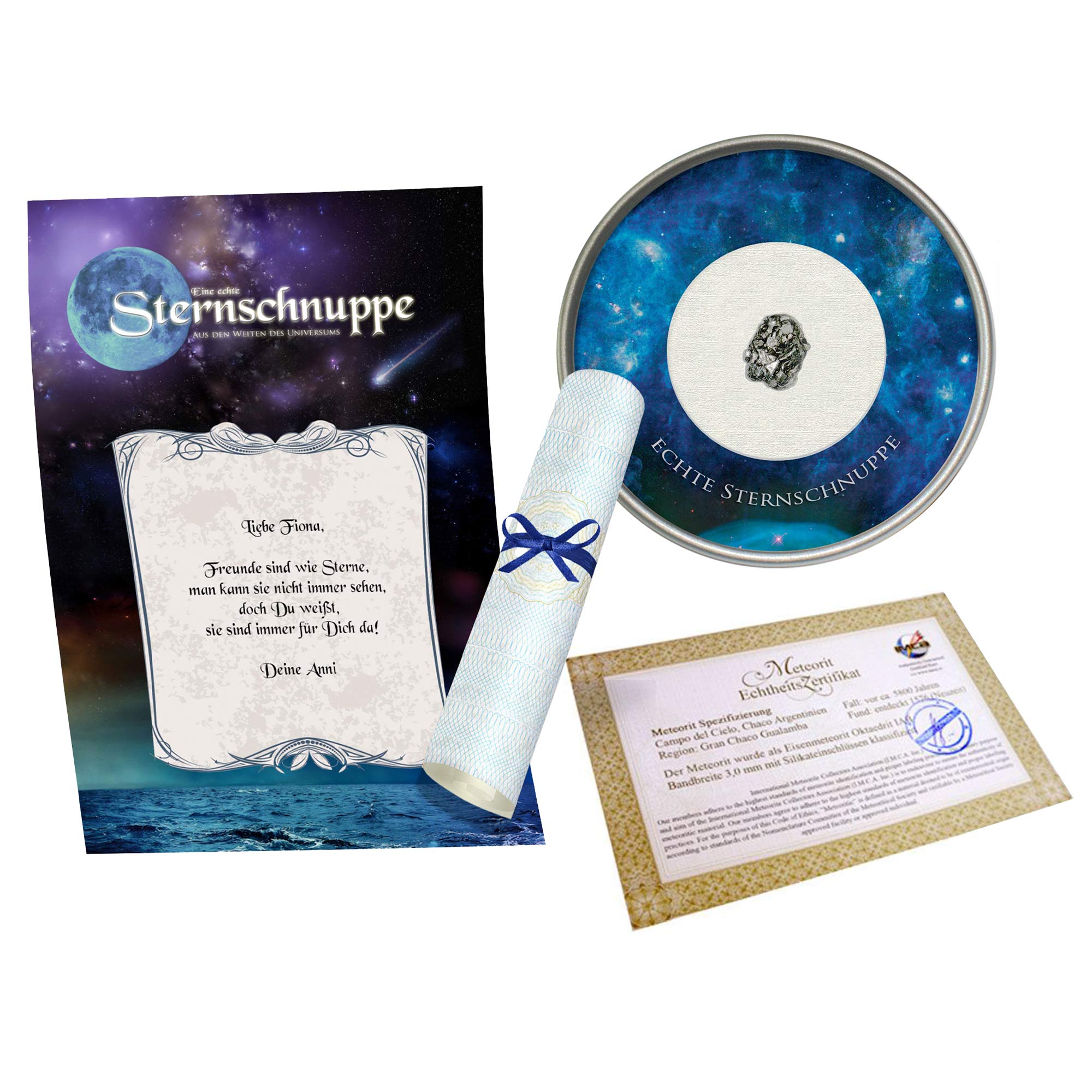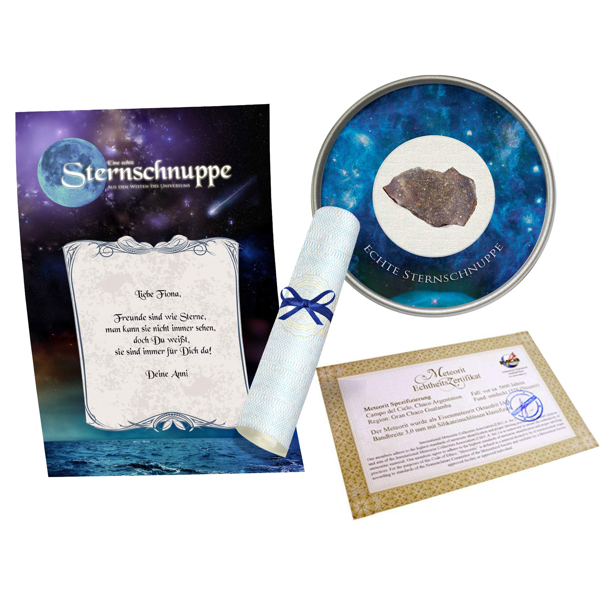 Optional kann die Sternschnuppe mit einer persönlichen Widmung versehen werden – so entsteht ein unvergessliches Andenken, das Emotion und Wissenschaft auf besondere Weise vereint. Das beiliegende Heft vermittelt spannende Hintergrundinformationen zur Herkunft des Meteoriten und zur Geschichte von Sternschnuppen. Jede Variante – ob Steinmeteorit oder Eisenmeteorit – wird mit Sorgfalt verpackt und auf Wunsch edel gerahmt. Ein Geschenk, das garantiert nicht von dieser Welt ist.