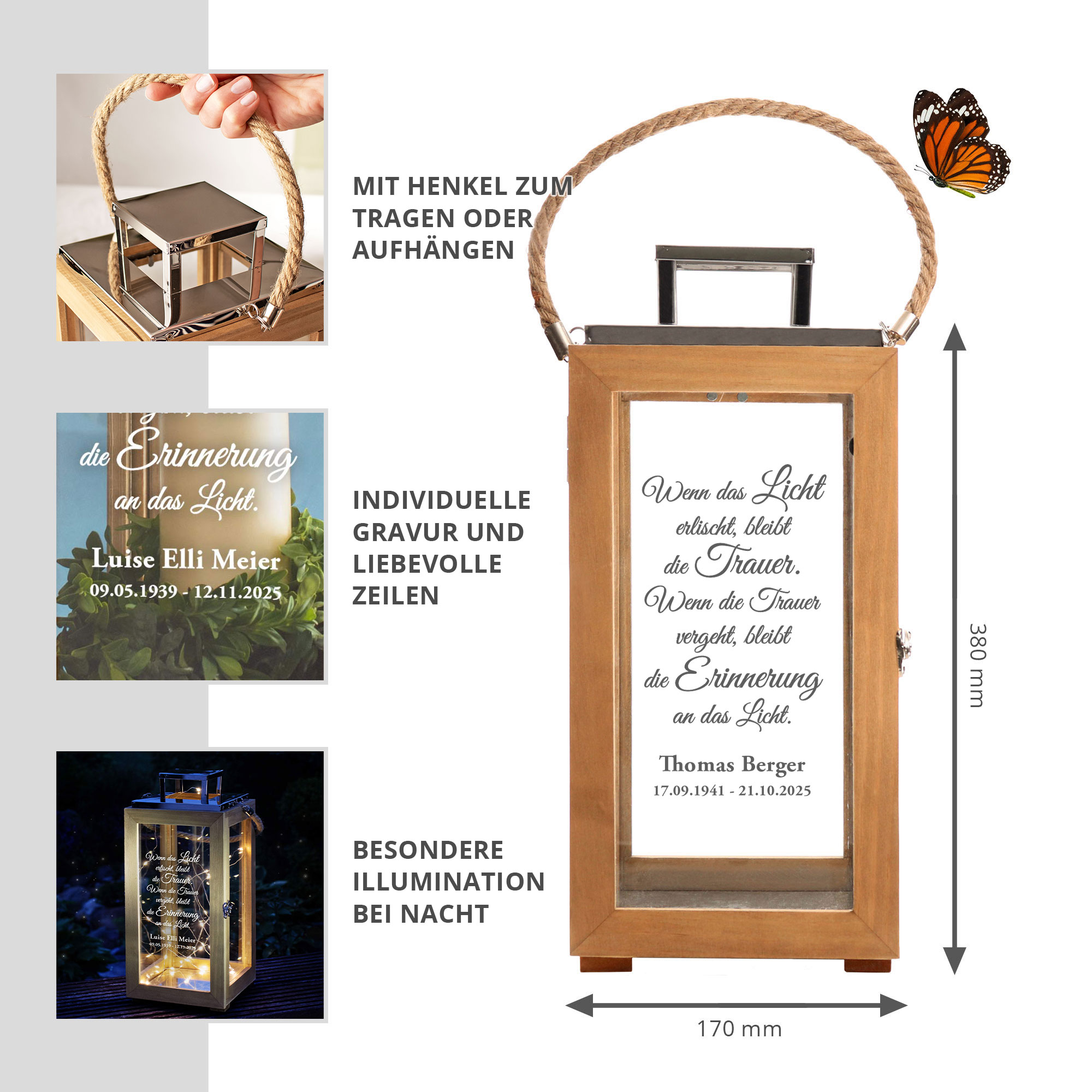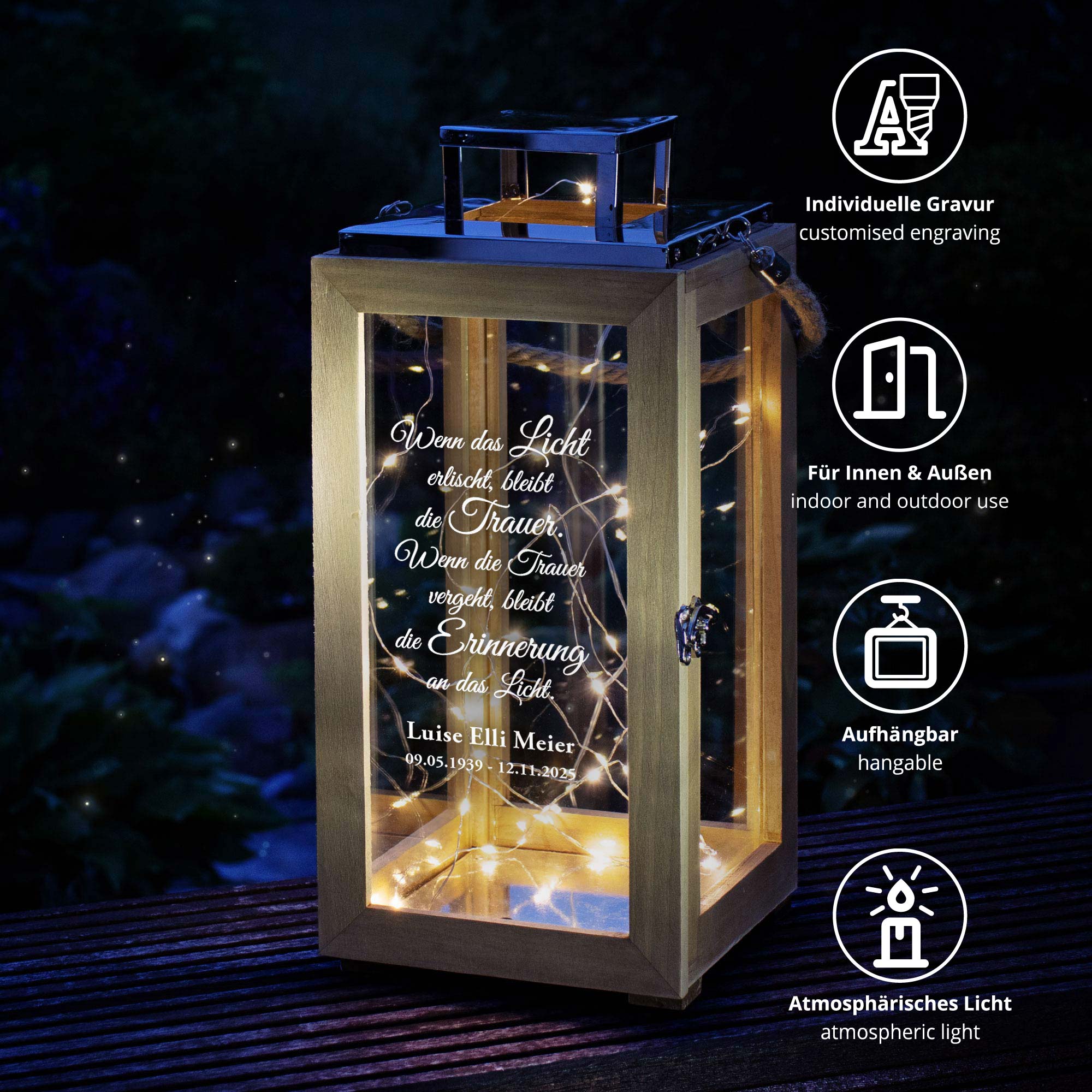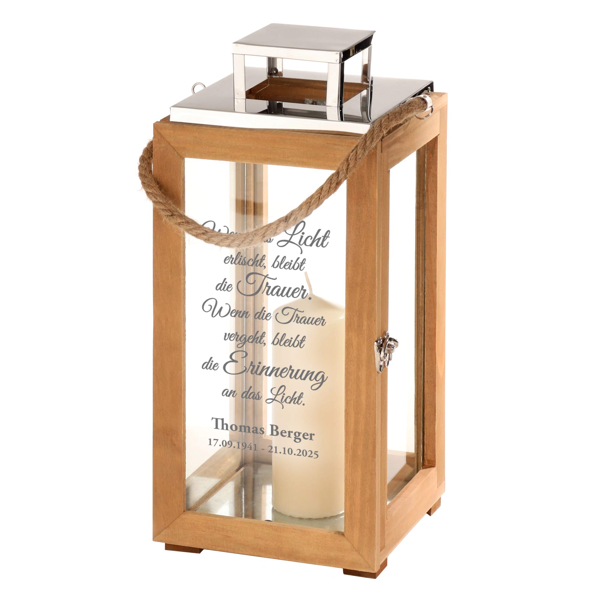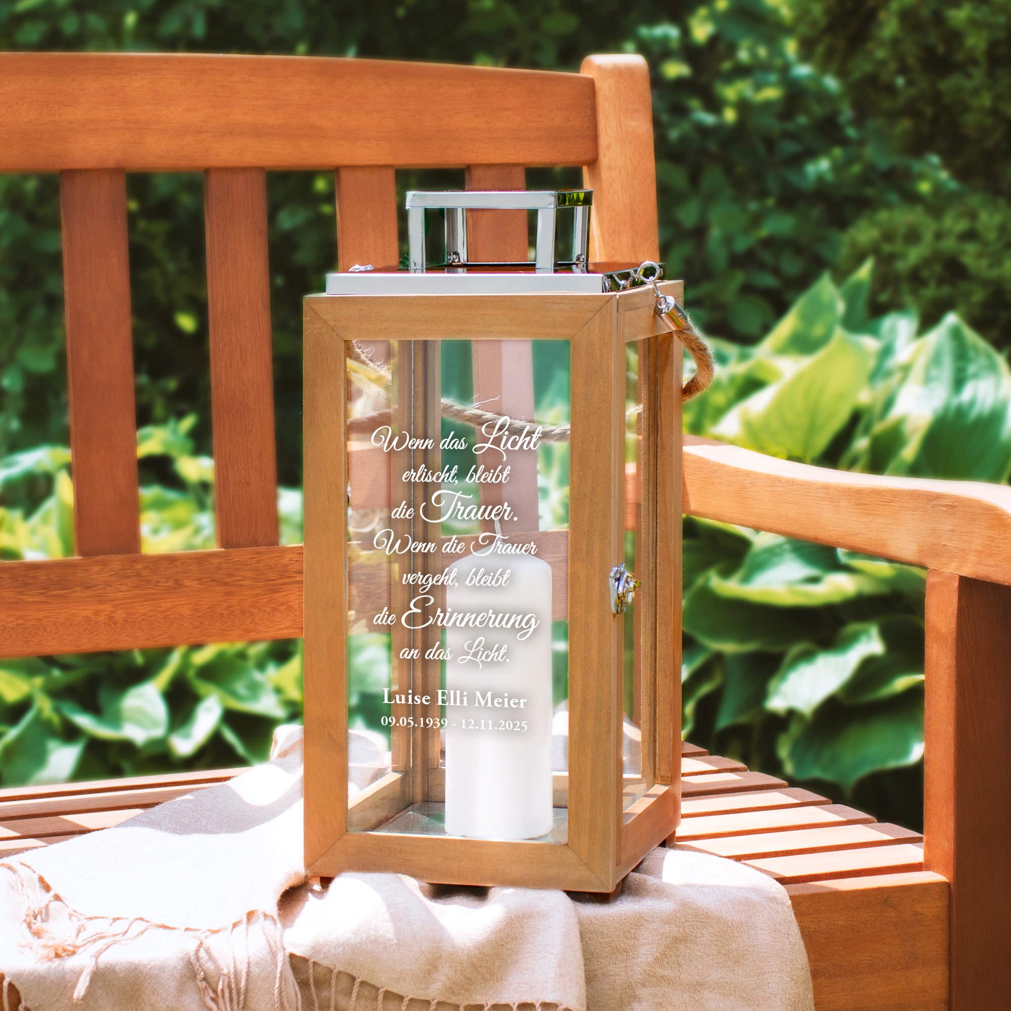 Die personalisierte Holz Trauerlaterne vereint natürliche Materialien mit einer einfühlsamen Botschaft: Wenn das Licht erlischt, bleibt die Trauer. Wenn die Trauer vergeht, bleibt die Erinnerung an das Licht. Die Gravur wird durch die Möglichkeit ergänzt, den Namen sowie das Geburts- oder Sterbedatum der verstorbenen Person hinzuzufügen. Das macht die Laterne zu einem einzigartigen Erinnerungsstück.