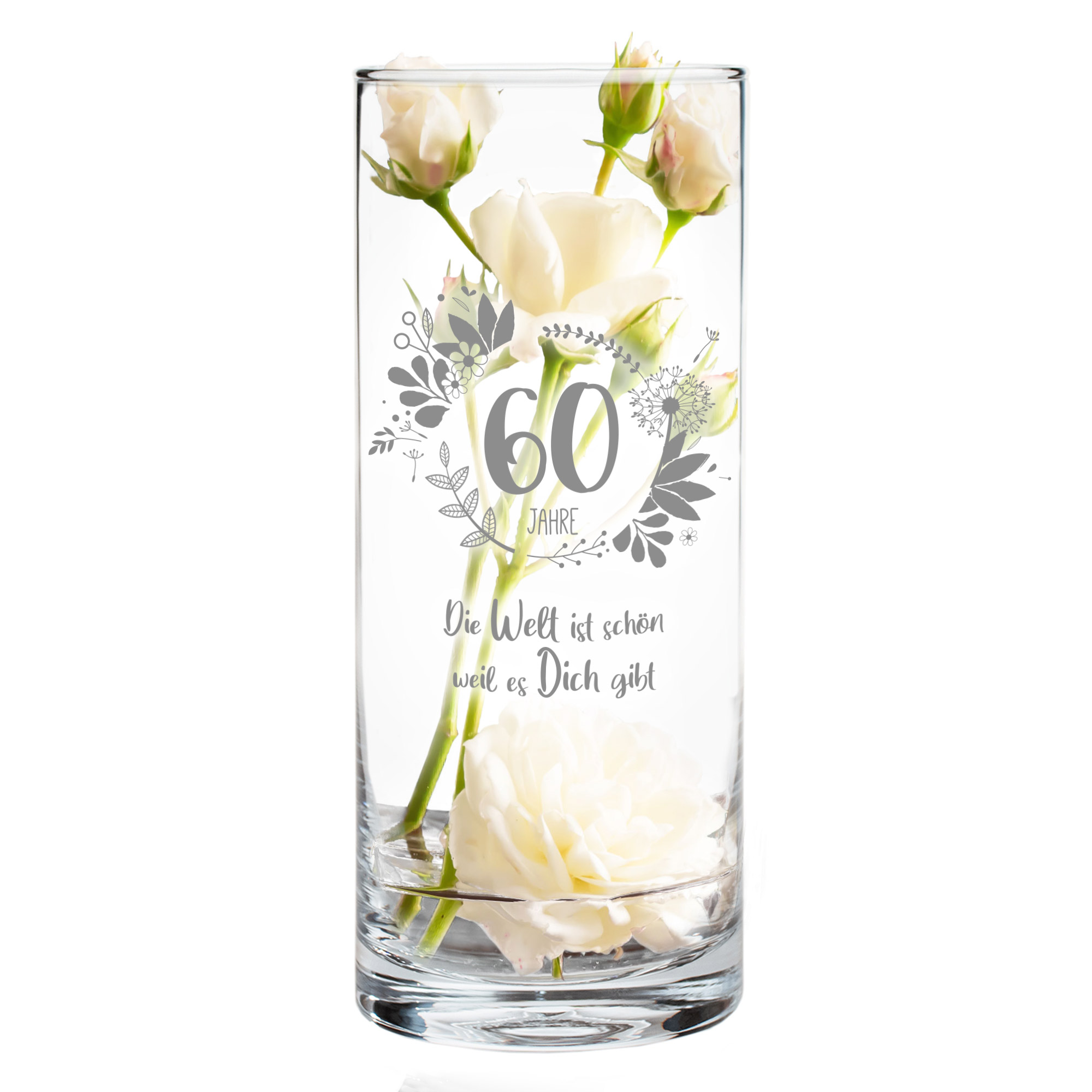 Zum 60. Geburtstag eine Geschenkidee mit besonderem Charme: Diese runde Glasvase überzeugt mit einer eleganten Gravur, die den Anlass stilvoll unterstreicht. Der Schriftzug "60 Jahre" sowie der Spruch "Die Welt ist schön, weil es Dich gibt" verleihen ihr eine persönliche und wertige Note.