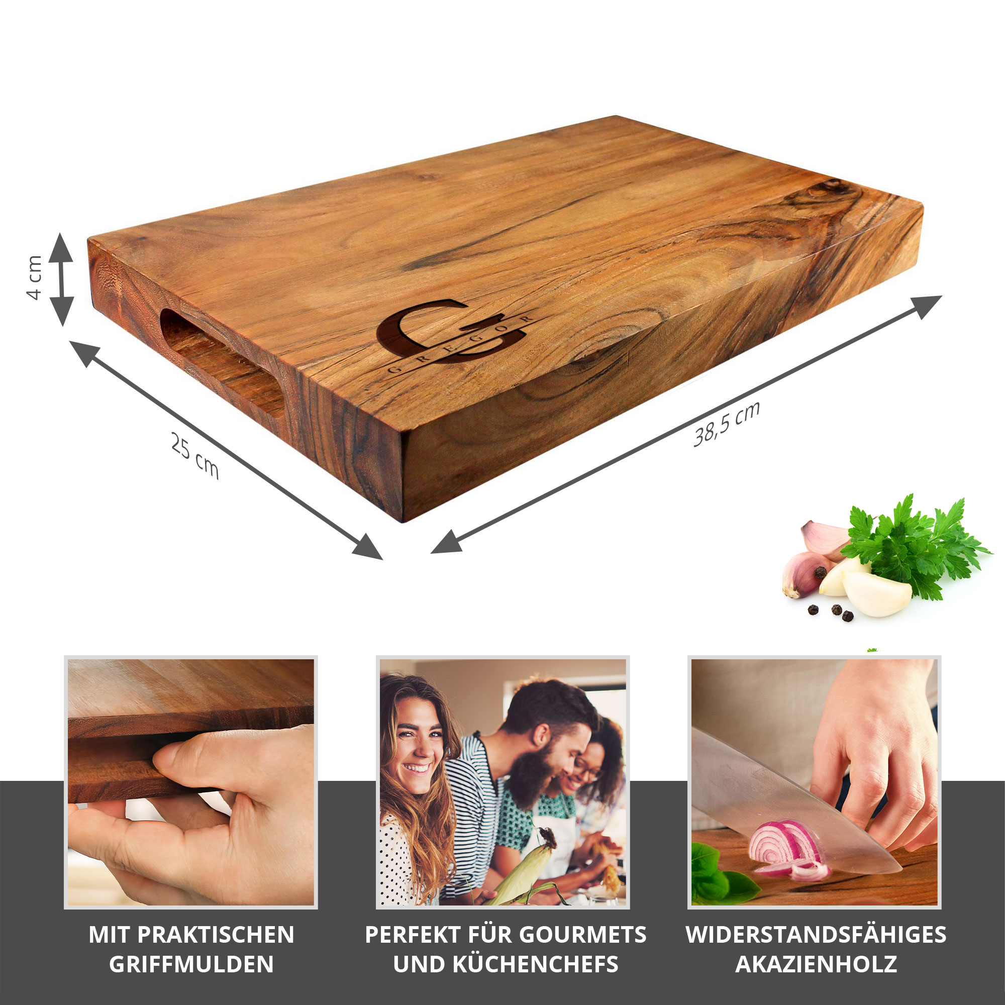 Schneideblock Akazie mit Griffmulden - Initial und Name