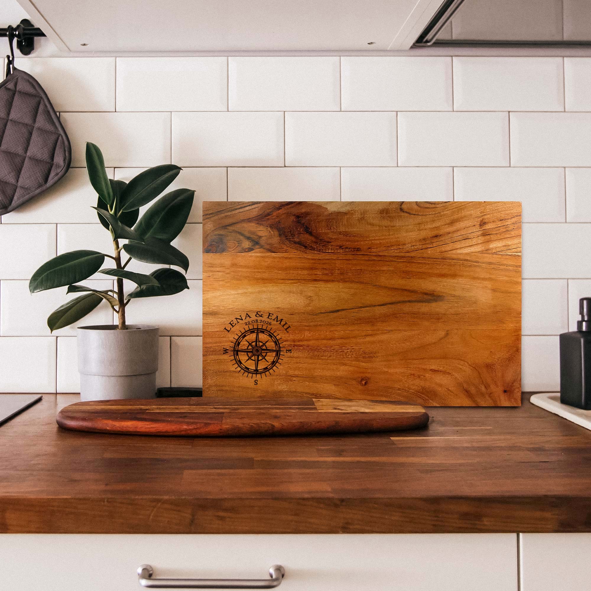 Dieses hochwertige Schneidebrett aus Akazienholz wird mit dem detailreichen Kompass-Motiv und Ihrem Wunschnamen zu einem individuellen Blickfang in jeder Küche. Die präzise Gravur verleiht dem massiven Holzbrett eine besondere Symbolkraft und steht für Orientierung, Beständigkeit und Stil. Durch die natürliche Maserung des Akazienholzes entsteht ein einzigartiges Gesamtbild.