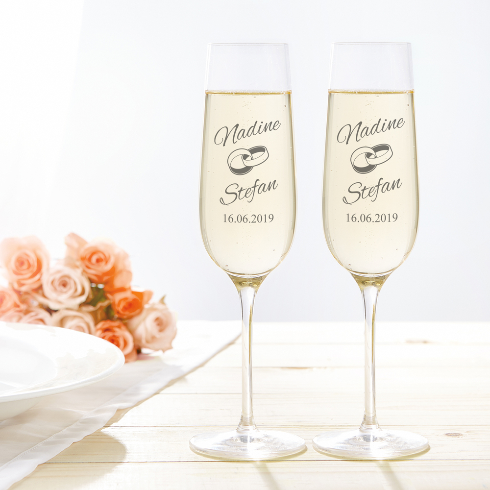 Eine Hochzeit ist Freudenfest - und wie feiert man am Besten? Mit Sekt natürlich. Am besten aus individuellen Gläsern.