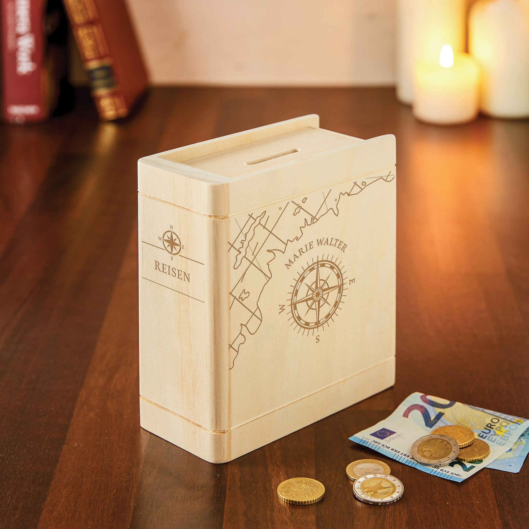 In jungen wie in alten Jahren gibt es kaum etwas Schöneres als Reisen und die Welt zu sehen. Leider brauchen große Touren lange Vorbereitungszeit und sind sehr teuer. Mit dem personalisierten Sparbuch aus Holz wird Sparen dabei noch schöner. Auf der Vorderseite wird ein Wunschname hochwertig eingraviert und über einem ebenfalls eingravierten Kompass verewigt. Die Sparbüchse in Buch Optik bietet sich als originelle Verpackung für Dein Geldgeschenk für Freunde und Familienmitglieder, die gern reisen.