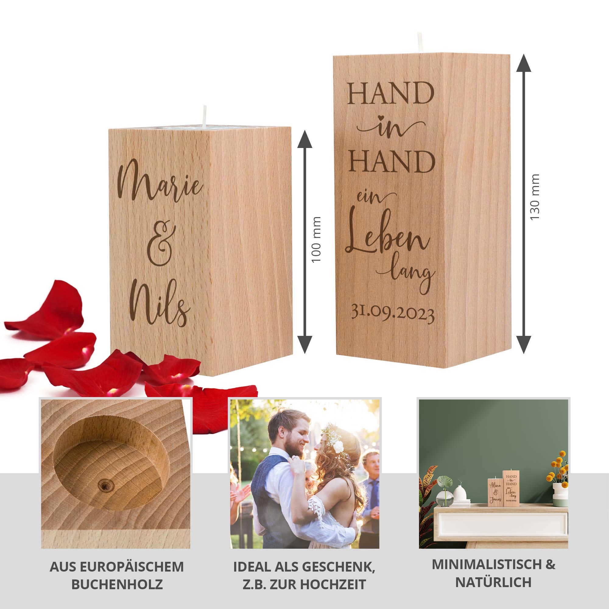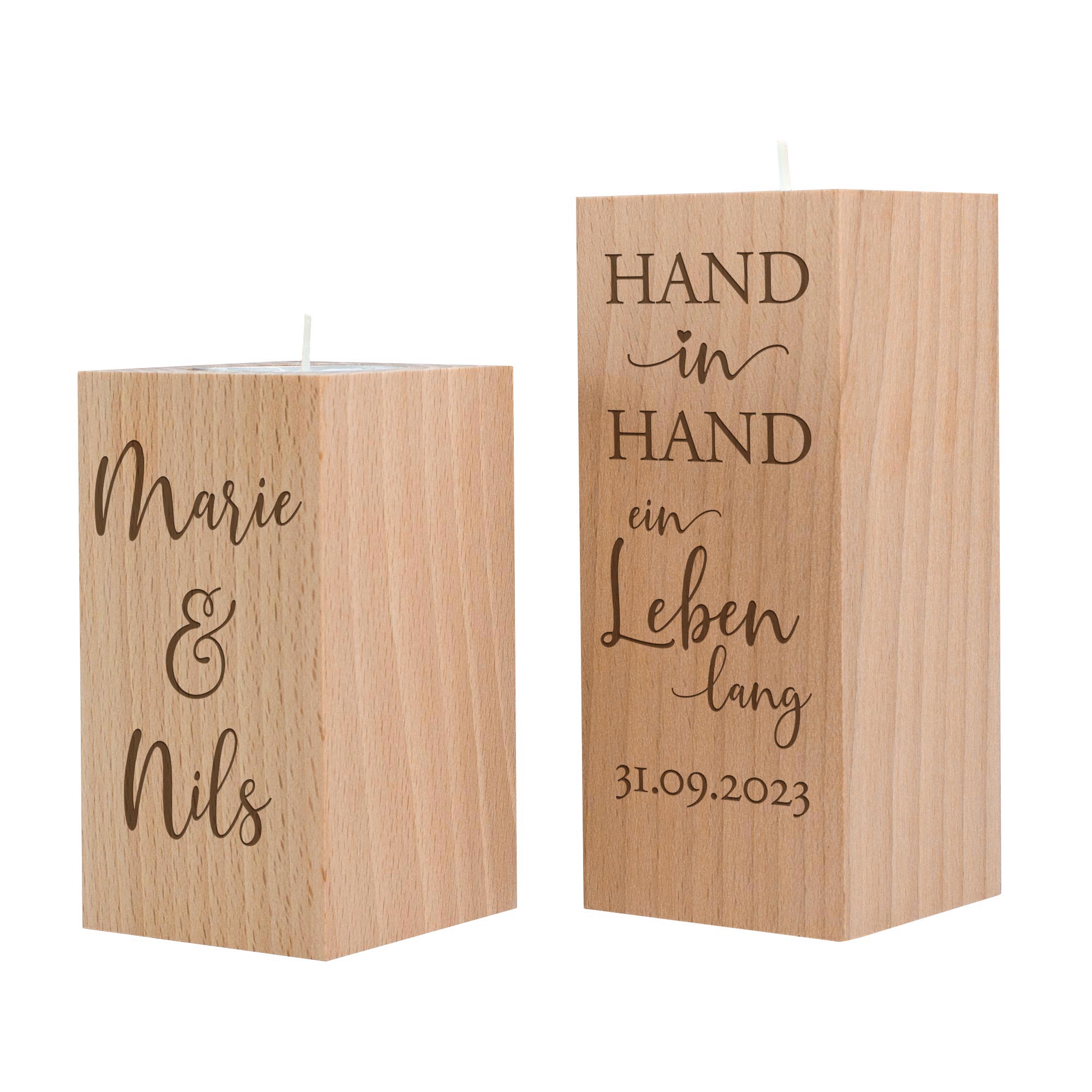 Teelichthalter Set - Eckig - Hochzeitspruch - Hand in Hand - Personalisiert
