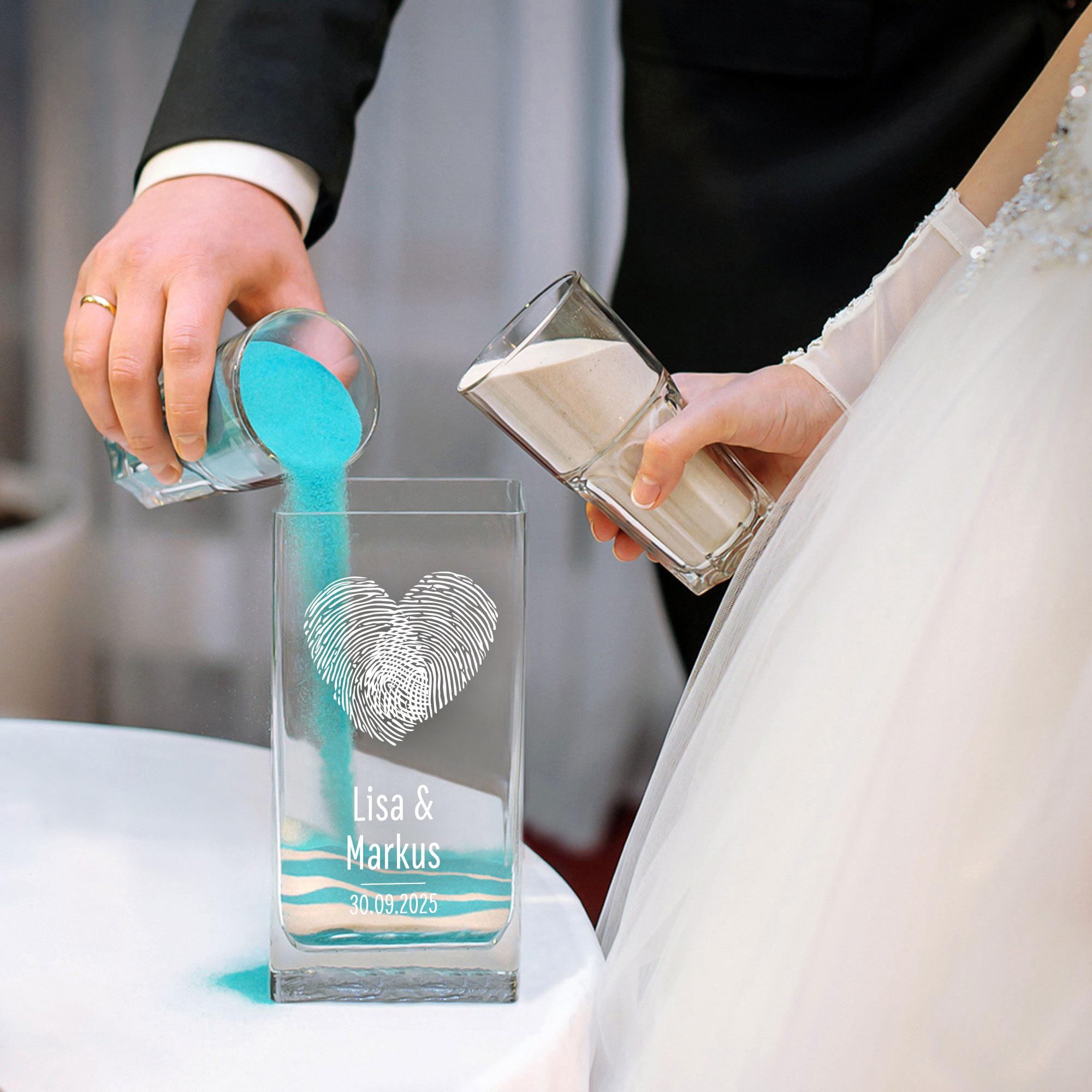 Das minimalistische Design aus hochwertigem Klarglas passt sich jeder Einrichtung harmonisch an und lässt Raum für kreative Gestaltung: Mit Blumen, Kerzen, Sand oder Naturmaterialien lässt sich die Vase individuell dekorieren. Die hochwertige Gravur sorgt für eine bleibende Botschaft der Liebe und Verbundenheit.