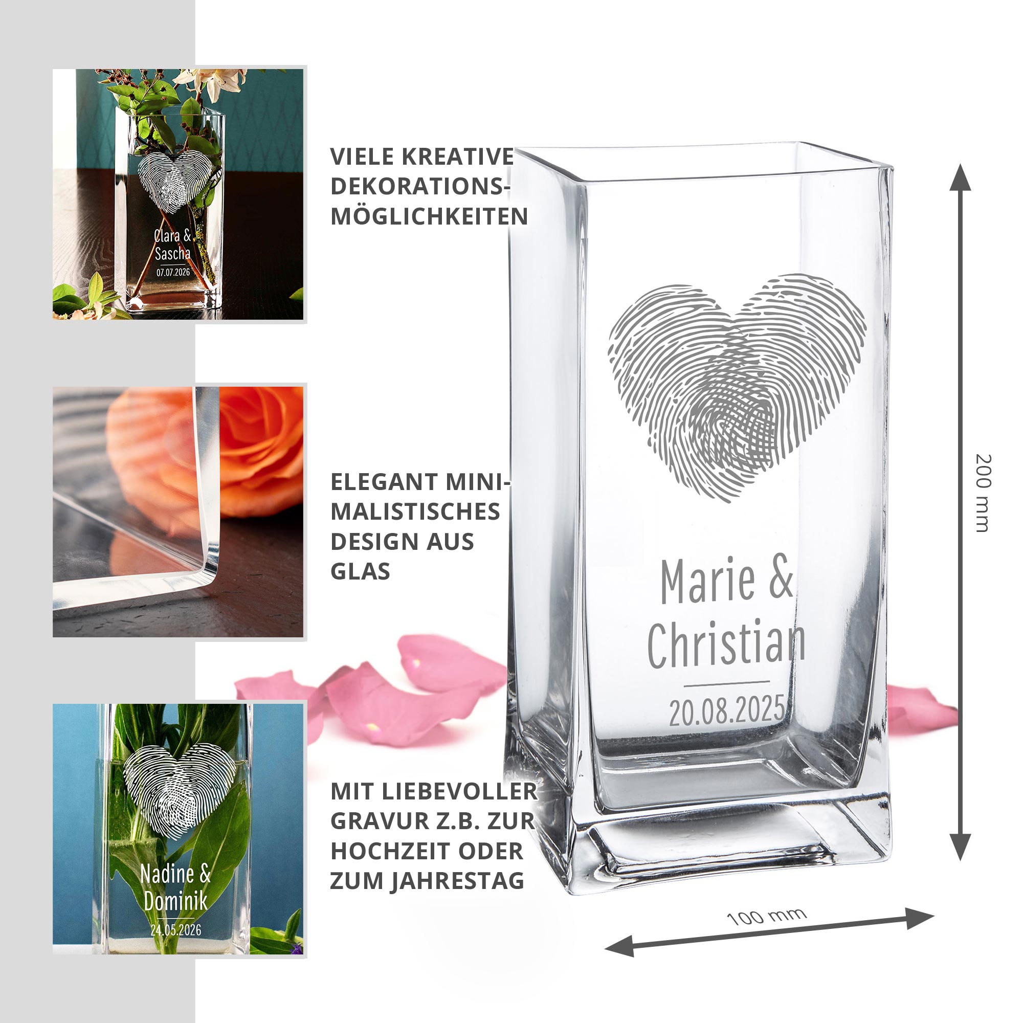 Diese elegante Glasvase wird durch das kunstvoll gravierte Fingerabdruck-Herz zu einem ganz persönlichen Geschenk. Ob zur Hochzeit, zum Valentinstag oder zum Jahrestag – die individuelle Gravur mit zwei Namen und einem Wunschdatum macht diese runde Vase zu einem bedeutungsvollen Erinnerungsstück an gemeinsame Momente.