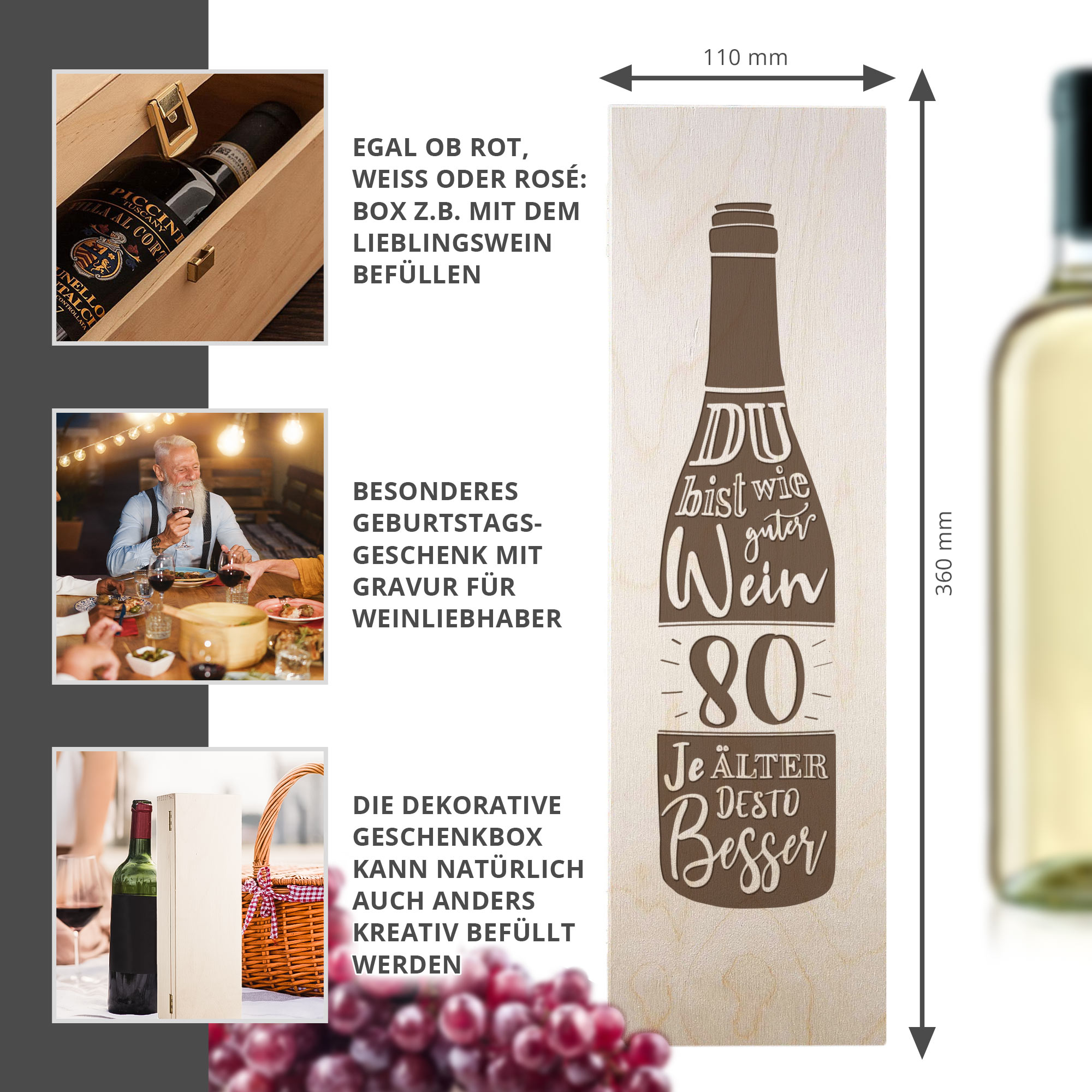 Gestalte ein persönliches Weingeschenk! Verpacke den Lieblingswein des Geburtstagskindes in der edlen Holzkiste mit Gravur und lege persönliche Botschaften, Gutscheine oder andere Kleinigkeiten bei. Ein einzigartiges Geschenk, das sich dem bedeutenden Anlass eines 80. Geburtstags auf jeden Fall würdig erweist.