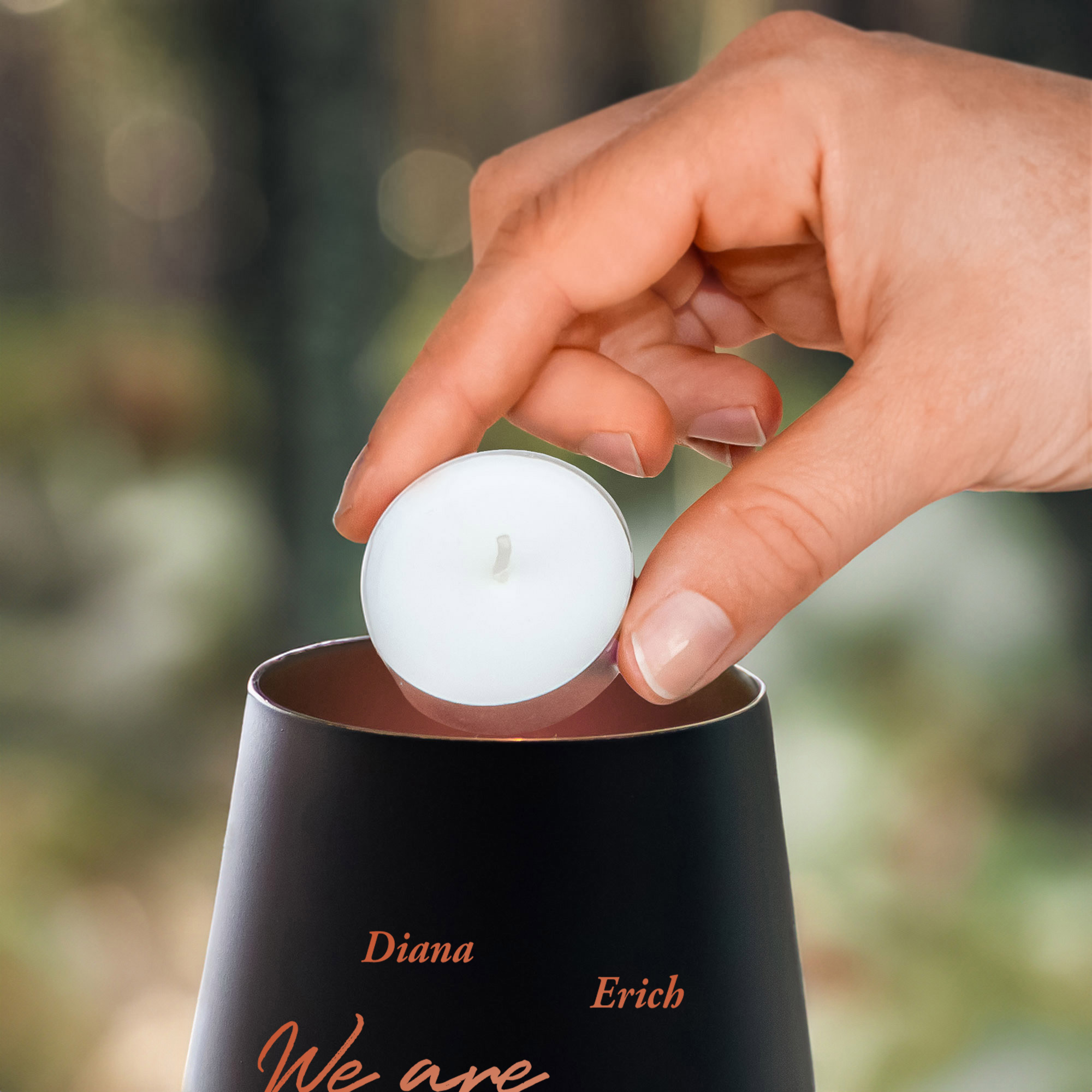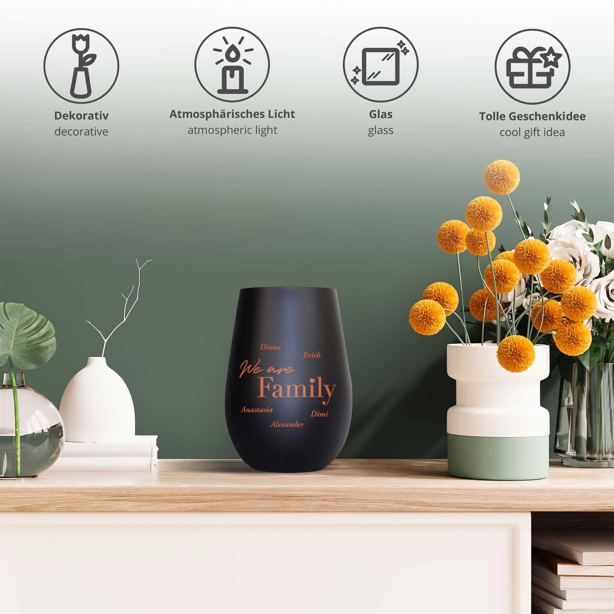 Dieses hochwertige Windlicht aus schwarzem Glas mit bronzefarbener Gravur überzeugt durch seine warme und elegante Ausstrahlung. Das Motiv We are Family wird mit den Namen Ihrer Liebsten ergänzt und macht das Windlicht zu einem ganz persönlichen Highlight. Die dezente Bronzeoptik verleiht dem Design eine besondere Tiefe und einen stilvollen Charakter.