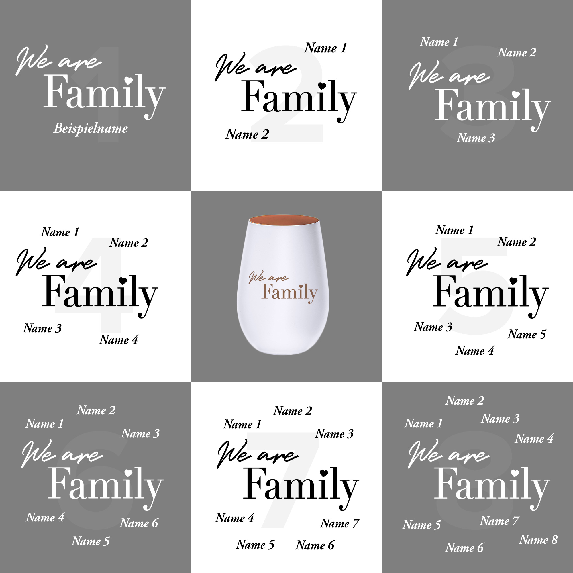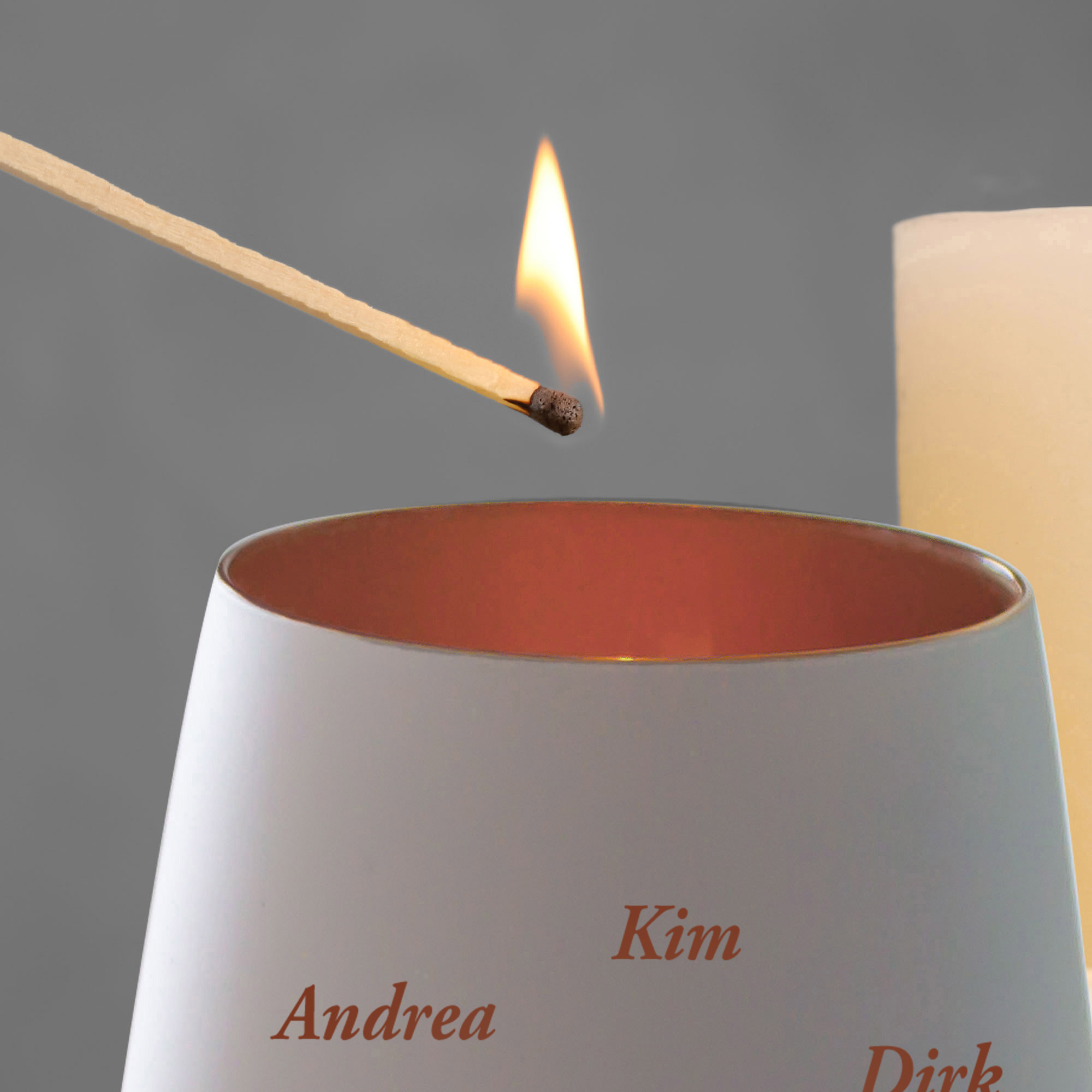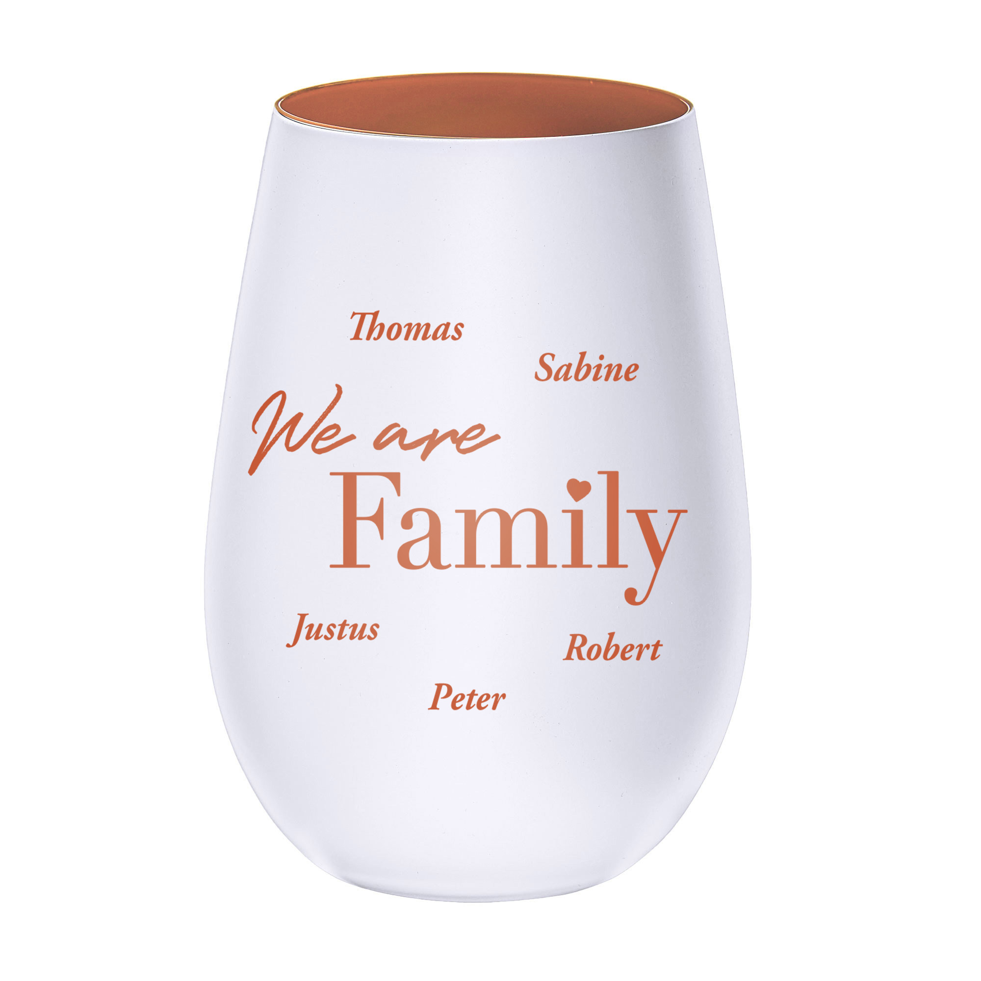 Dieses stilvolle Windlicht aus weißem Glas mit bronzefarbener Gravur vereint moderne Leichtigkeit mit einer persönlichen Note. Das Motiv We are Family wird individuell mit den Namen Ihrer Familienmitglieder ergänzt und macht jedes Stück zu einem einzigartigen Erinnerungsobjekt. Die Kombination aus hellem Glas und warmer Bronzegravur sorgt für eine besonders harmonische Wirkung.
