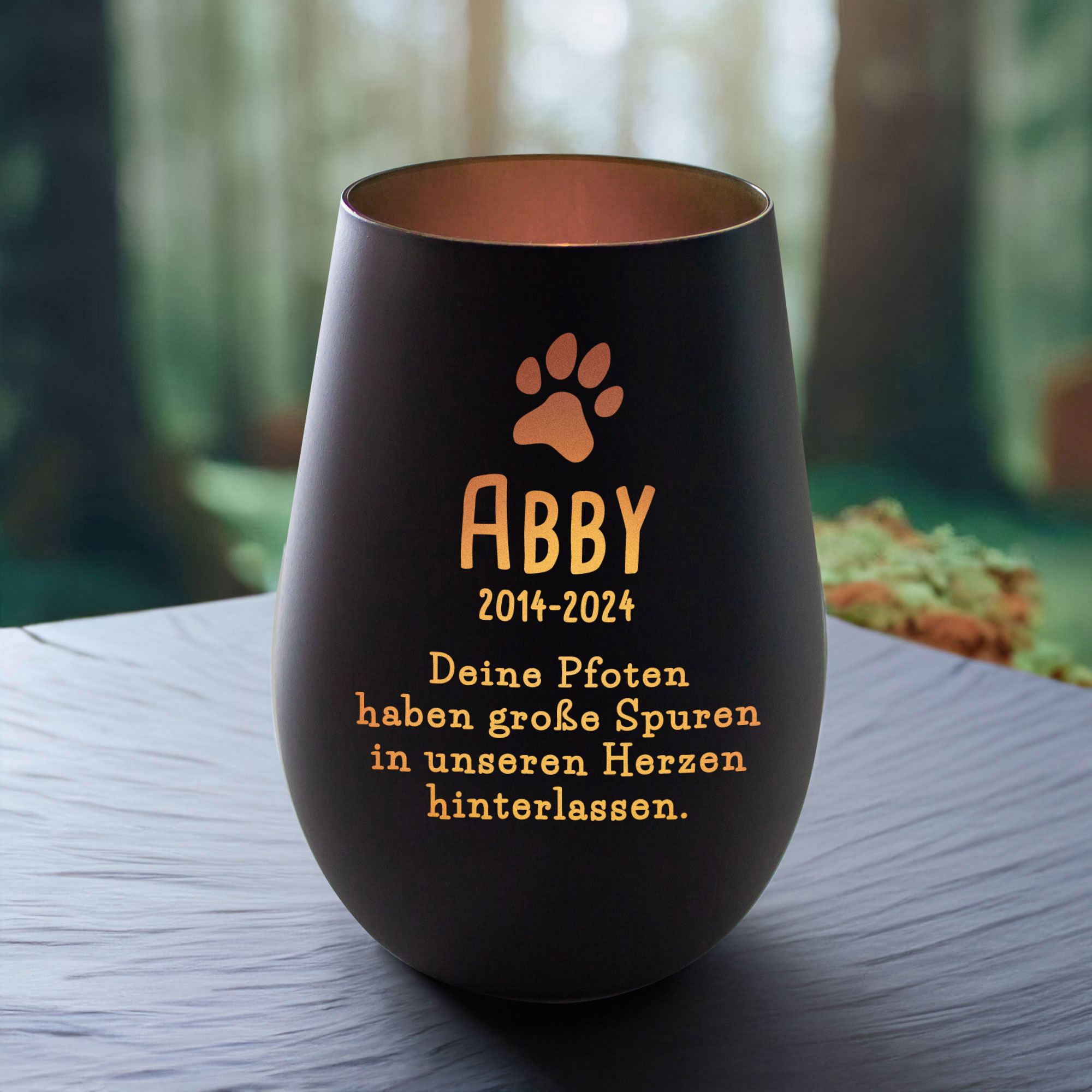Die bronzefarbene Innenfläche reflektiert das Licht und macht dieses Gedenklicht zu einem wertvollen Trostspender in schweren Stunden. Es eignet sich perfekt für den Lieblingsplatz Deines Hundes oder als leuchtendes Symbol des Gedenkens an Deinen vierbeinigen besten Freund.