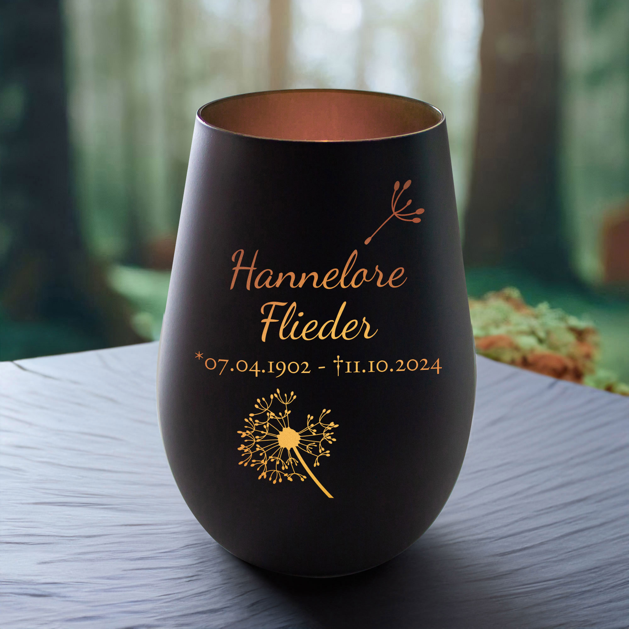 Das schwarze Trauerlicht Windlicht mit Pusteblume Gravur ist ein persönliches Zeichen des Gedenkens an einen geliebten Menschen. Der elegante Glaskerzenhalter in mattem Schwarz ist mit einer goldenen Gravur versehen – inklusive Name, Geburts- und Sterbedatum sowie dem zarten Motiv einer Pusteblume, das sinnbildlich für Loslassen und die Weiterreise der Seele steht.